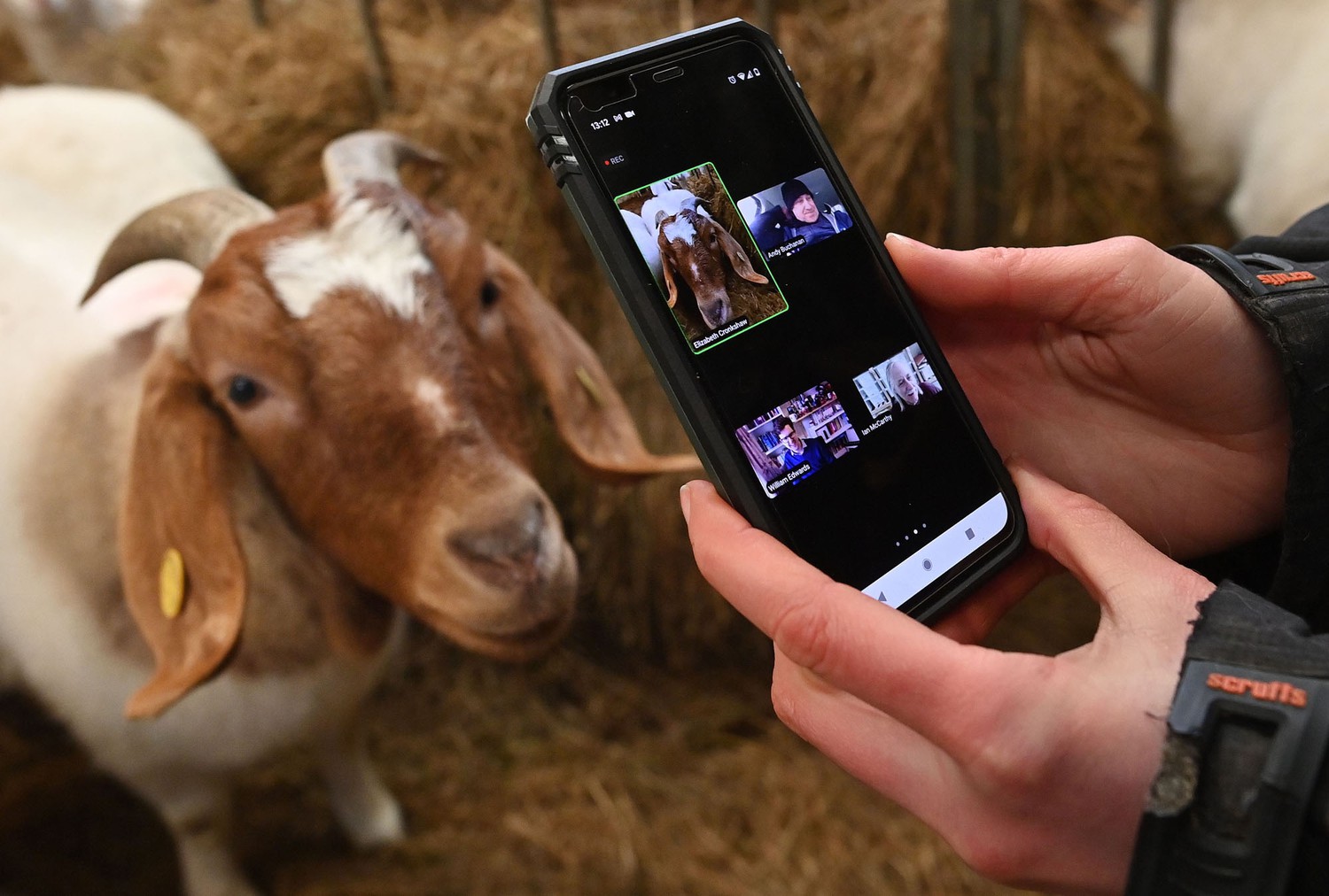Fermierul englez Dot McCarthy își filmează una dintre capre pentru un apel Zoom. McCarthy a venit cu ideea de a-și închiria caprele pentru conferințe Zoom și a genera astfel venituri în perioada de lockdown. Paul Ellis / AFP / Getty: