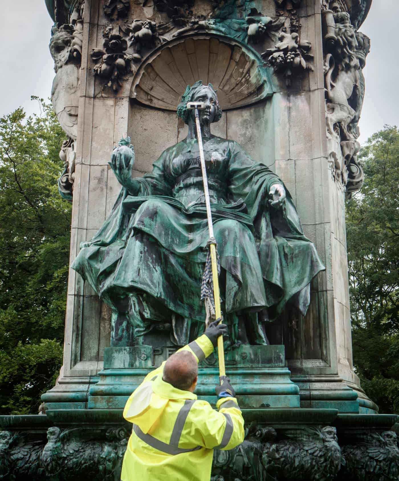 Fotografia dimineții – Un angajat al primăriei curață statuia Reginei Victoria din Leeds, vandalizată în timpul protestelor Black Lives Matter. Danny Lawson/PA: