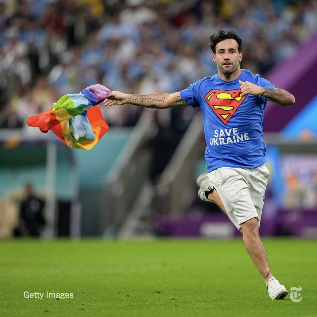 Fotografia dimineții – Un suporter a intrat pe teren la meciul dintre Portugalia și Uruguay, de la Cupa Mondială din Qatar, având un steag în culorile curcubeului, simbolul comunității LGBTQ+, și un tricou pe care scria “Salvați Ucraina” pe față și “Respect pentru femeile iraniene” pe spate: