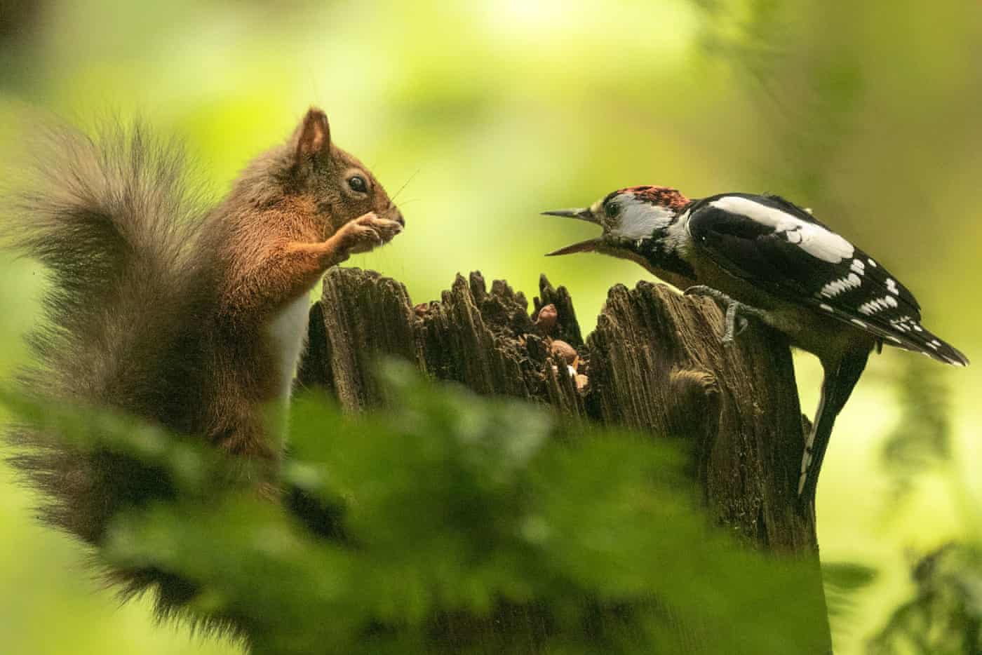 Fotografia dimineții – O veveriță și o ciocănitoare se “ceartă” pe ghinde într-o pădure din Marea Britanie. Karen Crawford/SWNS.COM: