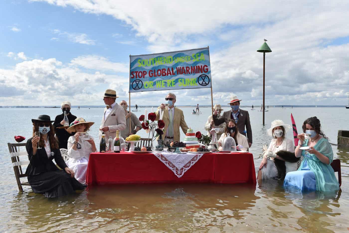 Fotografia dimineții – Protest al activiștilor de mediu englezi care au simulat o cină de pe Titanic pe una din plajele din Anglia. John Keeble/Getty Images: