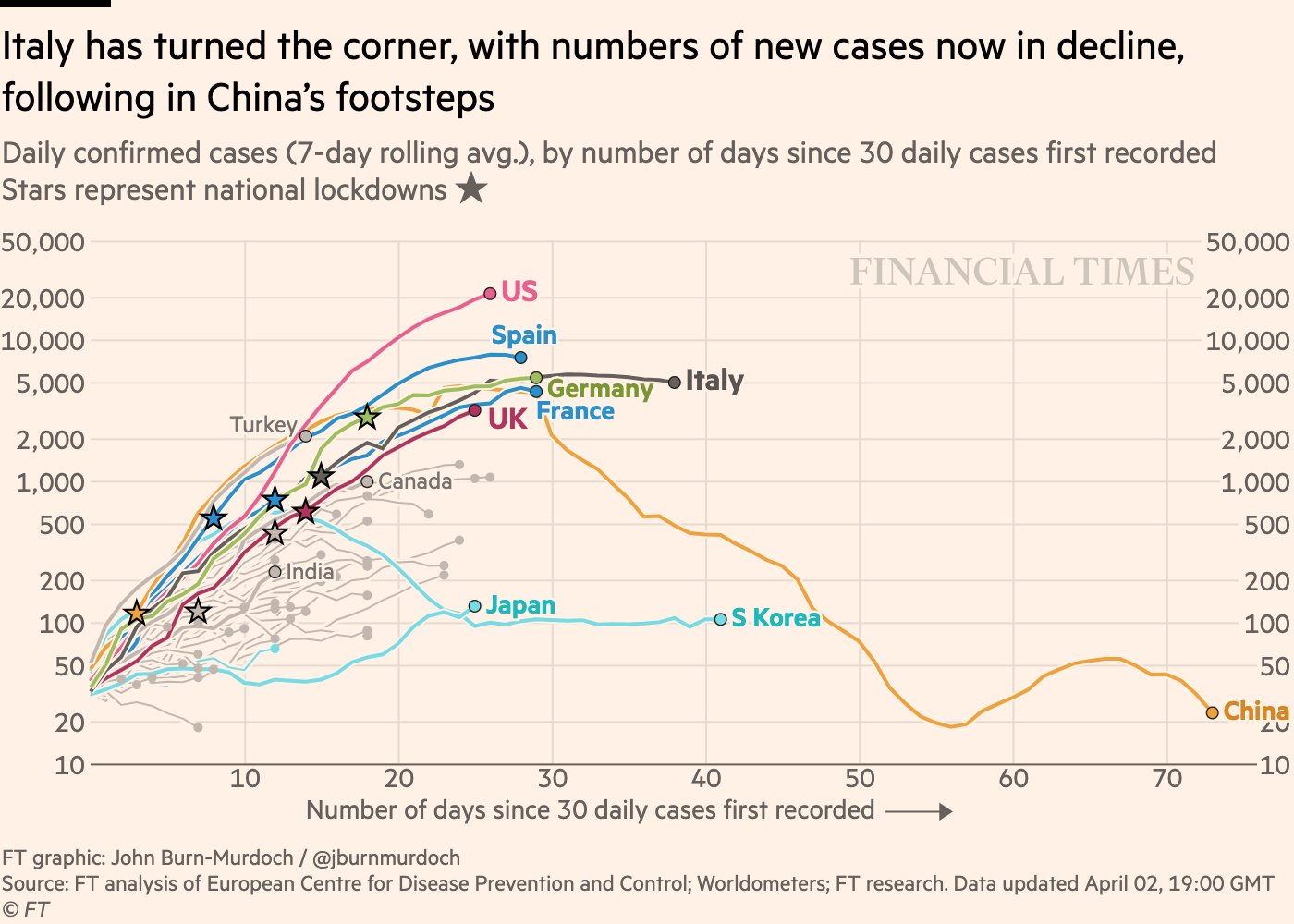 Fotografia dimineții este un grafic care arată plafonarea cazurilor noi în Italia și Spania: