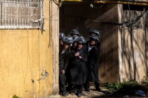 Fotografia dimineții – Mai mulți bărbați urmăresc un protest al evreilor ultraortodocși împotriva presiunilor de a-i recruta în armata israeliană, lângă un birou de recrutare militară, în Ierusalim. Ronen Zvulun/Reuters: