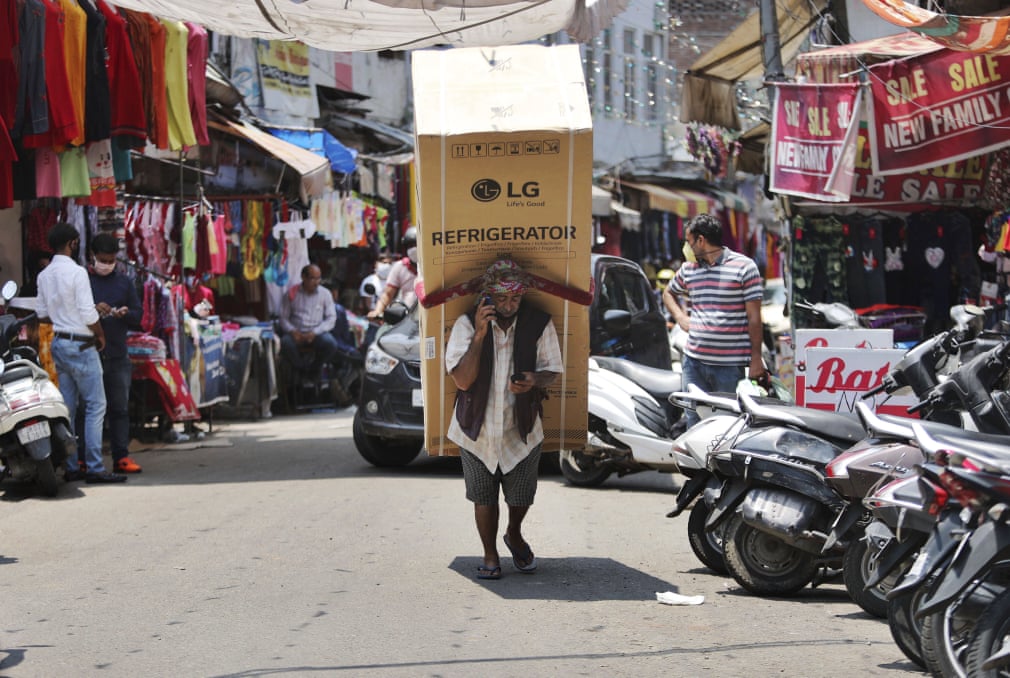 Fotografia serii – Un lucrător din India vorbește la telefon în timp ce transporta un frigider în spate. Channi Anand/AP: