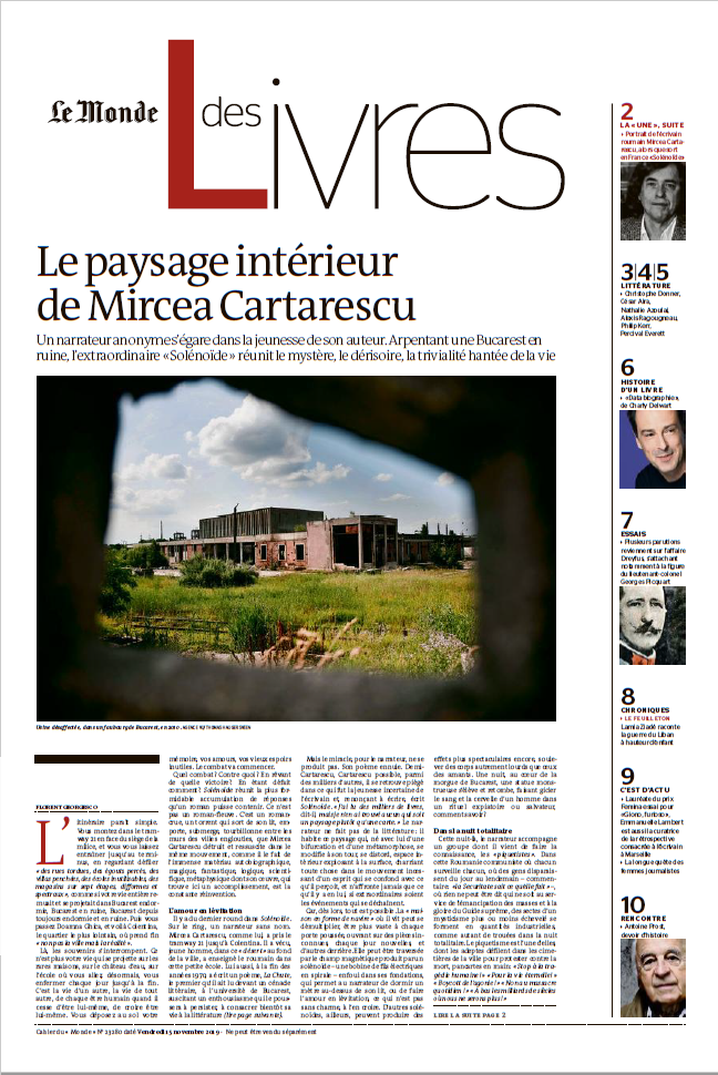 Fotografia ediției: Prima pagină din Le Monde Des Livres din 15 noiembrie a fost consacrată în întregime romanului ”Solenoid” de Mircea Cărtărescu. Sursă: LeMonde.fr.