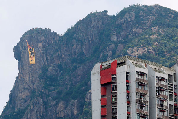 Fotografia dimineții – Un banner pe care scrie “Luptați pentru Hong Kong” este ridicat deasupra orașului de manifestanții pro democratie. Tyrone Siu / Reuters:
