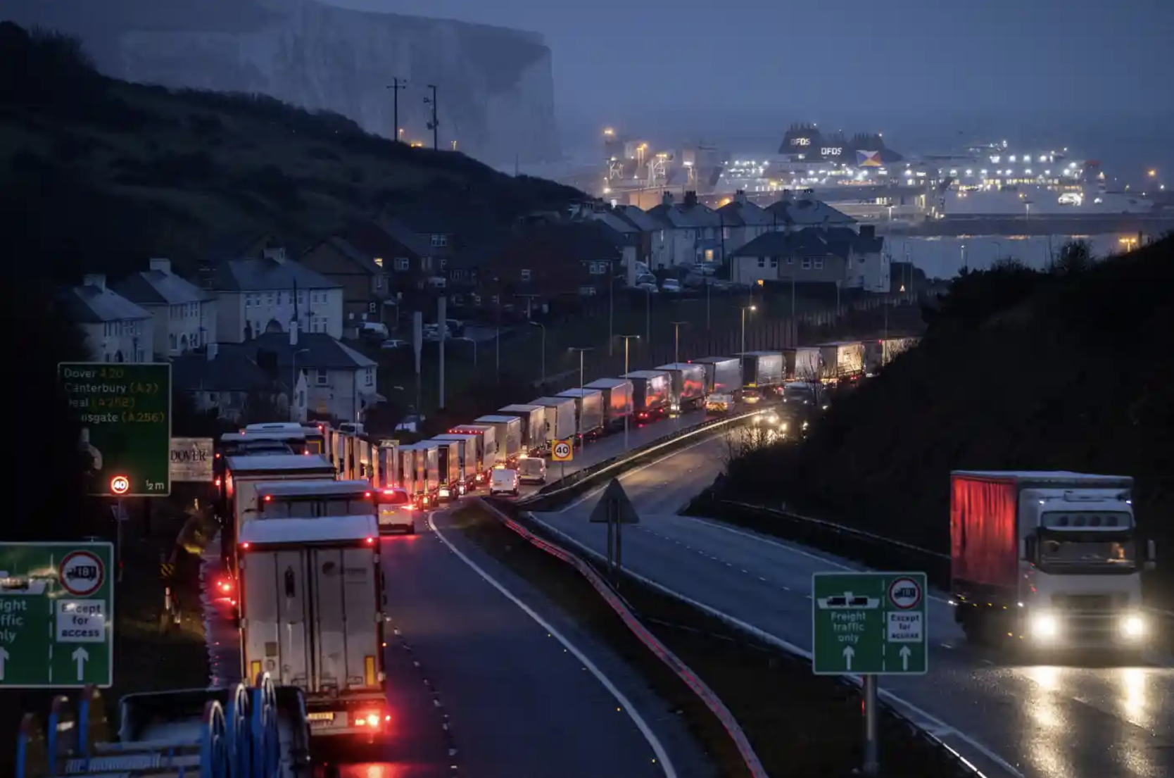 Fotografia dimineții – Tiruri care stau la coadă în Dover, Anglia, pentru a fi îmbarcate spre Franța. Marea Britanie și Uniunea Europeană nu au ajuns încă la un acord comercial oentru Brexit. Dan Kitwood/Getty Images: