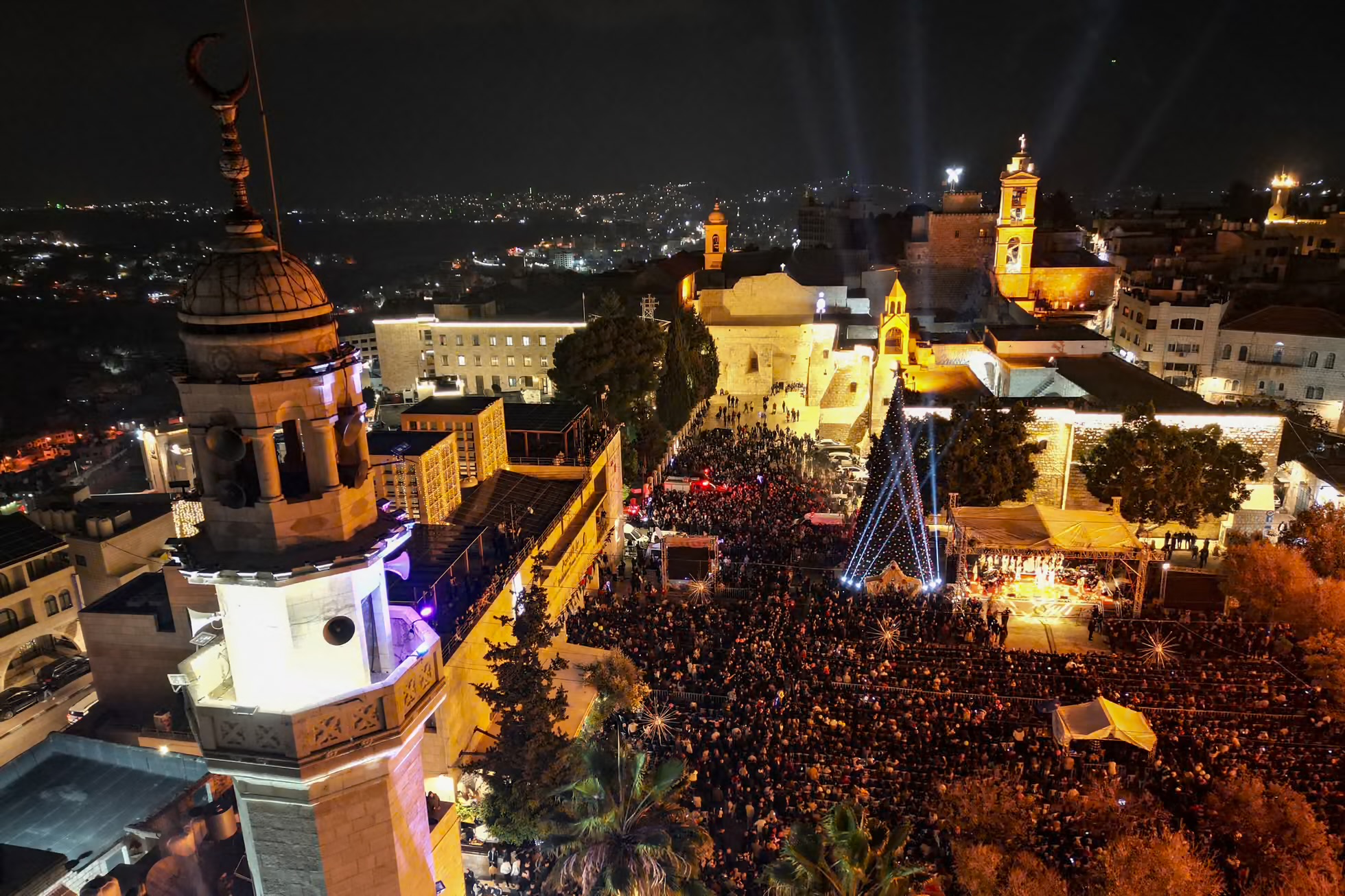 Fotografia dimineții este din Betleem, Cisiordania, unde oamenii s-au adunat în Piața Nașterii Domnului pentru ceremonia iluminării bradului de Crăciun. Hazem Bader/AFP/Getty Images: