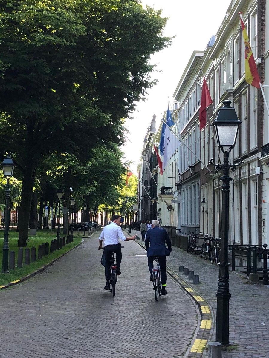 Fotografia dimineții – Premierul Olandei, Mark Rutte, și cel al Letoniei, Arturs Krišjānis Kariņš, pe străzile din Haga. Sursa: