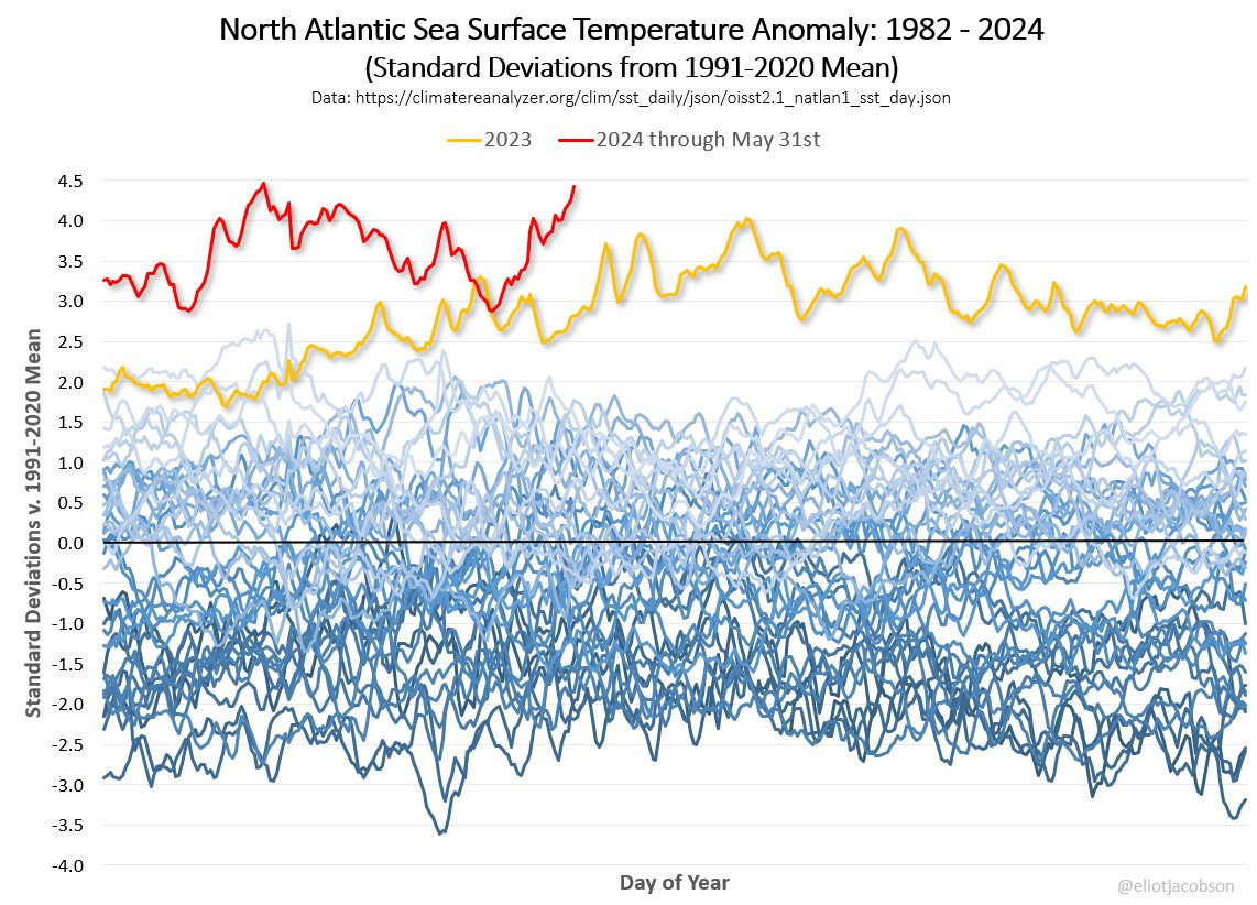 Poza ediției: Pe 31 Mai 2024, temperaturile de la suprafața mării din Atlanticul de Nord au atins 4.43 deviație standard peste media 1991-2020, a doua cea mai mare anomalie zilnică de temperatură înregistrată vreodată. Anomalia maximă a avut loc pe 21 februarie 2024, la 4.47 deviație standard.