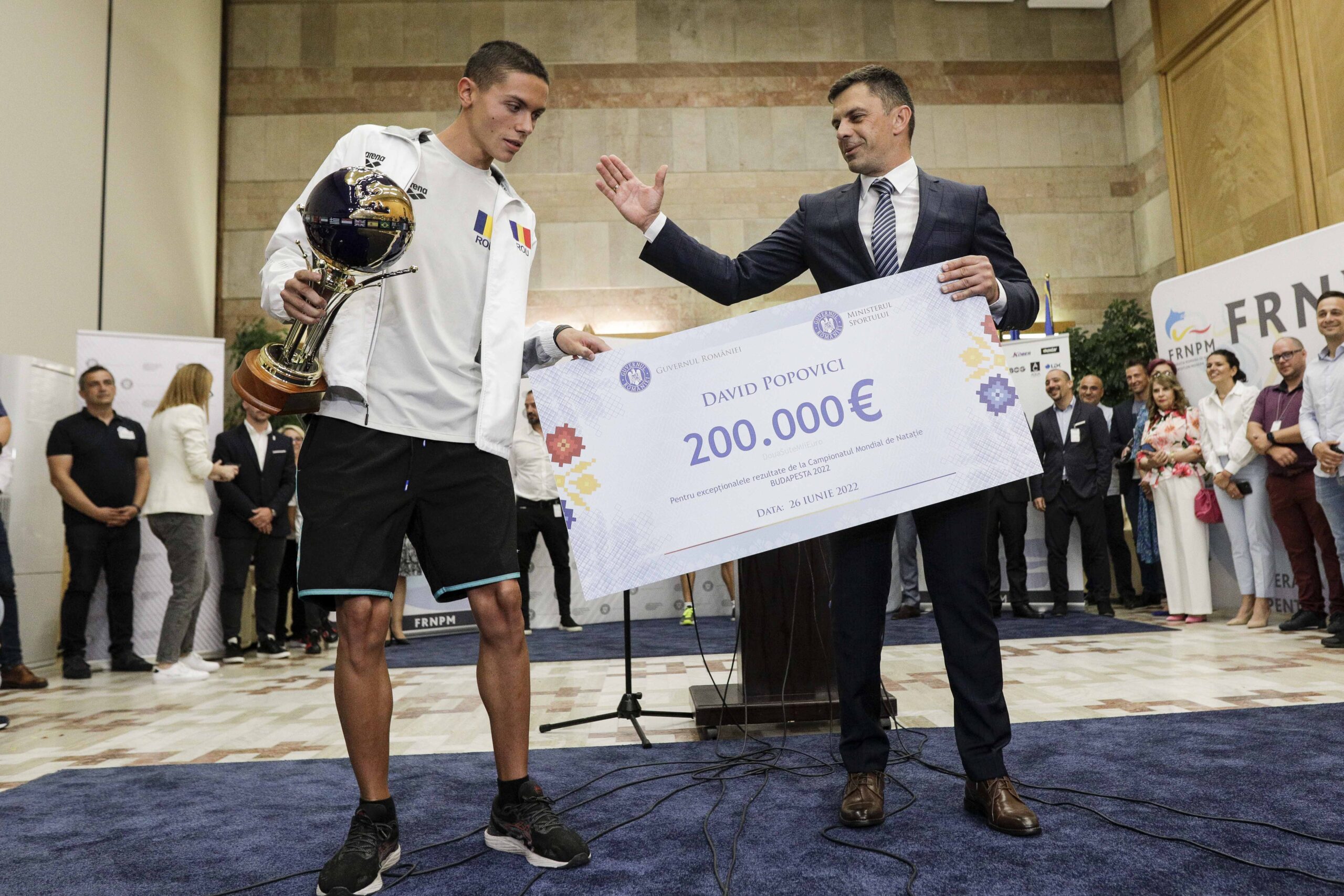 Fotografia dimineții – Campionul mondial David Popovici, sosit duminică seara în țară, primește cec-ul de 200.000 euro de la ministrul Sportului. Inquam Photos / George Calin: