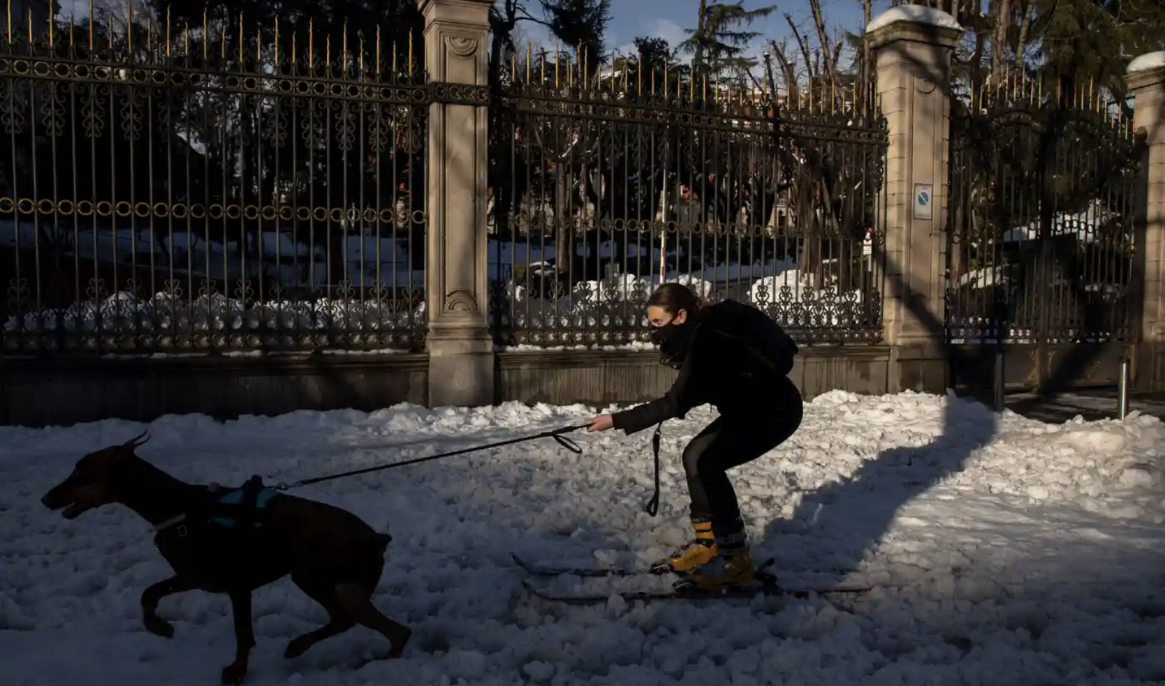 Fotografia dimineții – O femeie pe schiuri este trasă de câinele sau pe străzile din Madrid. Pablo Blázquez Domínguez/Getty Images: