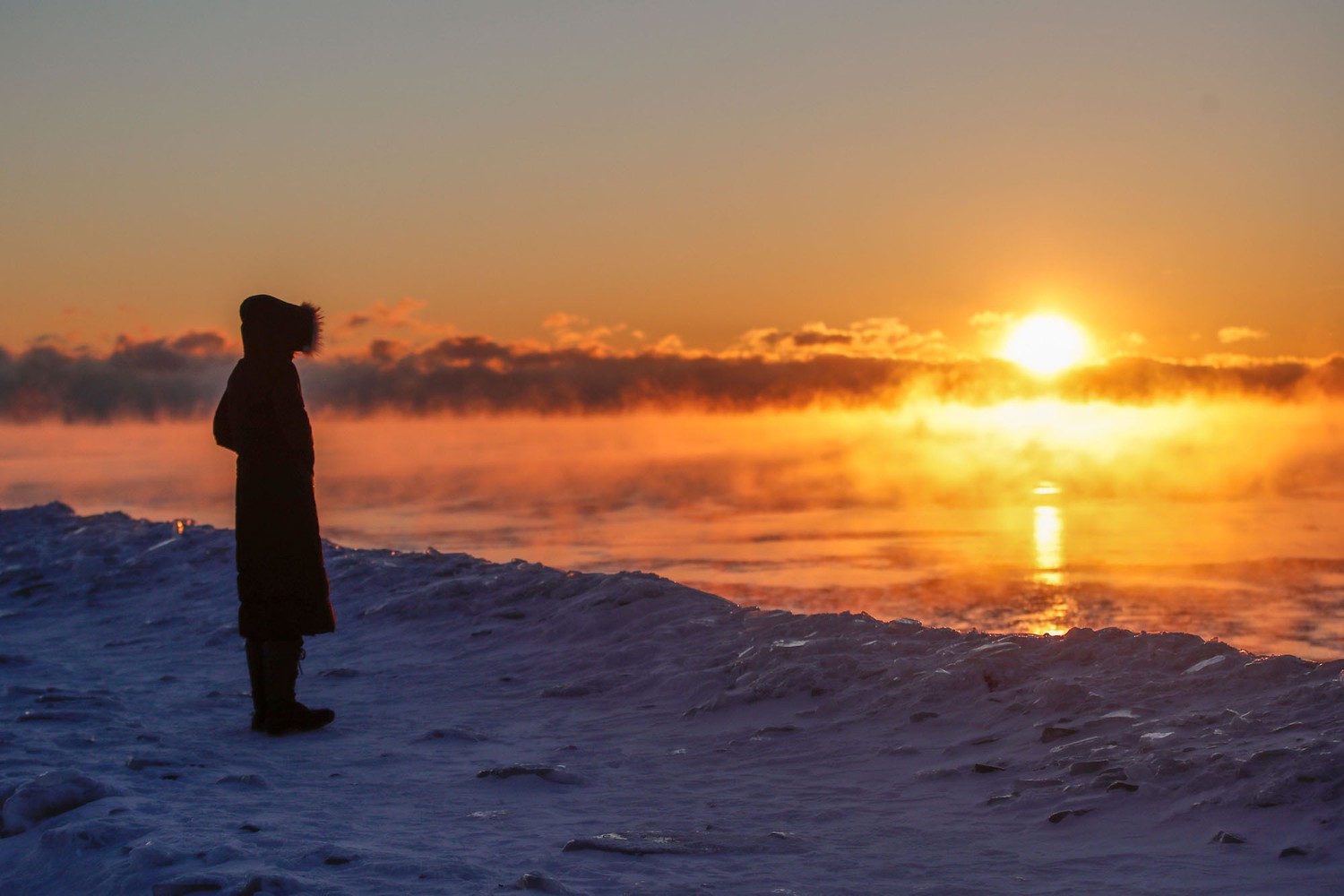 Fotografia diminetii – Un barbat se plimba pe malul lacului Michigan in timp ce soarele rasare deasupra orasului Chicago. Kamil Krzaczynski / AFP / Getty: