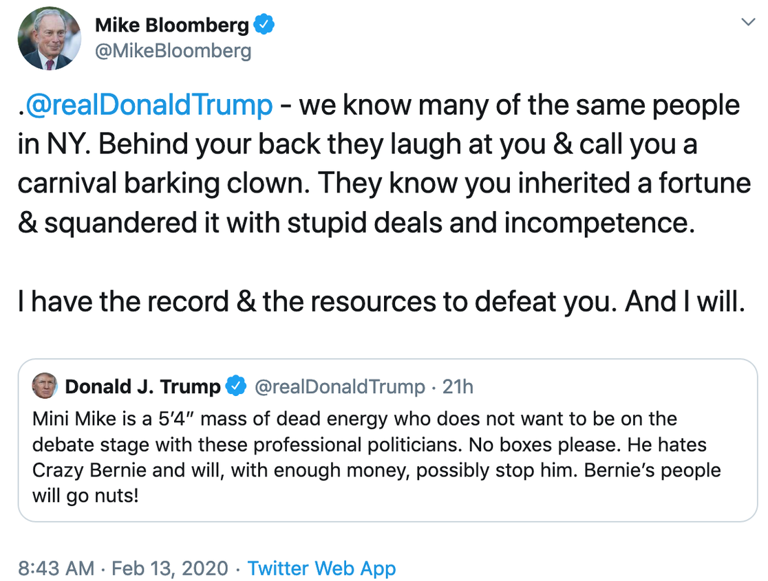 Fotografia serii – Schimb de tweeturi între președintele Trump și Michael Bloomberg: