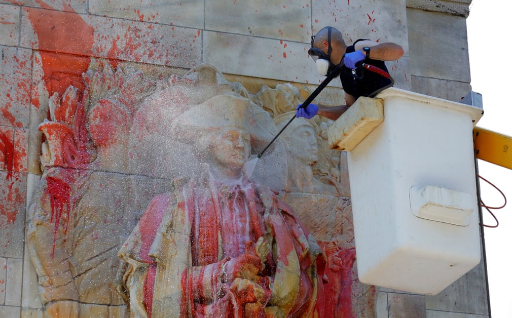 Fotografia serii – Un angajat curată statuia lui George Washington din Washington Square Park, NYC, după ce a fost vandalizată în urma protestelor. Jason Szenes/EPA: