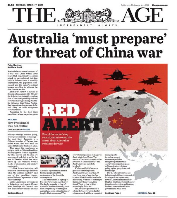 Fotografia dimineții – Prima pagină a unui cotidian australian care îndeamnă la pregătiri de război pentru amenințările Chinei: