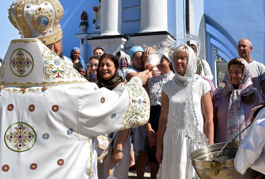 Fotografia serii – Enoriașii sunt stropiți, de un preot, cu apă sființită la Kiev. Olena Khudiakova/Ukrinform/Barcroft Media: