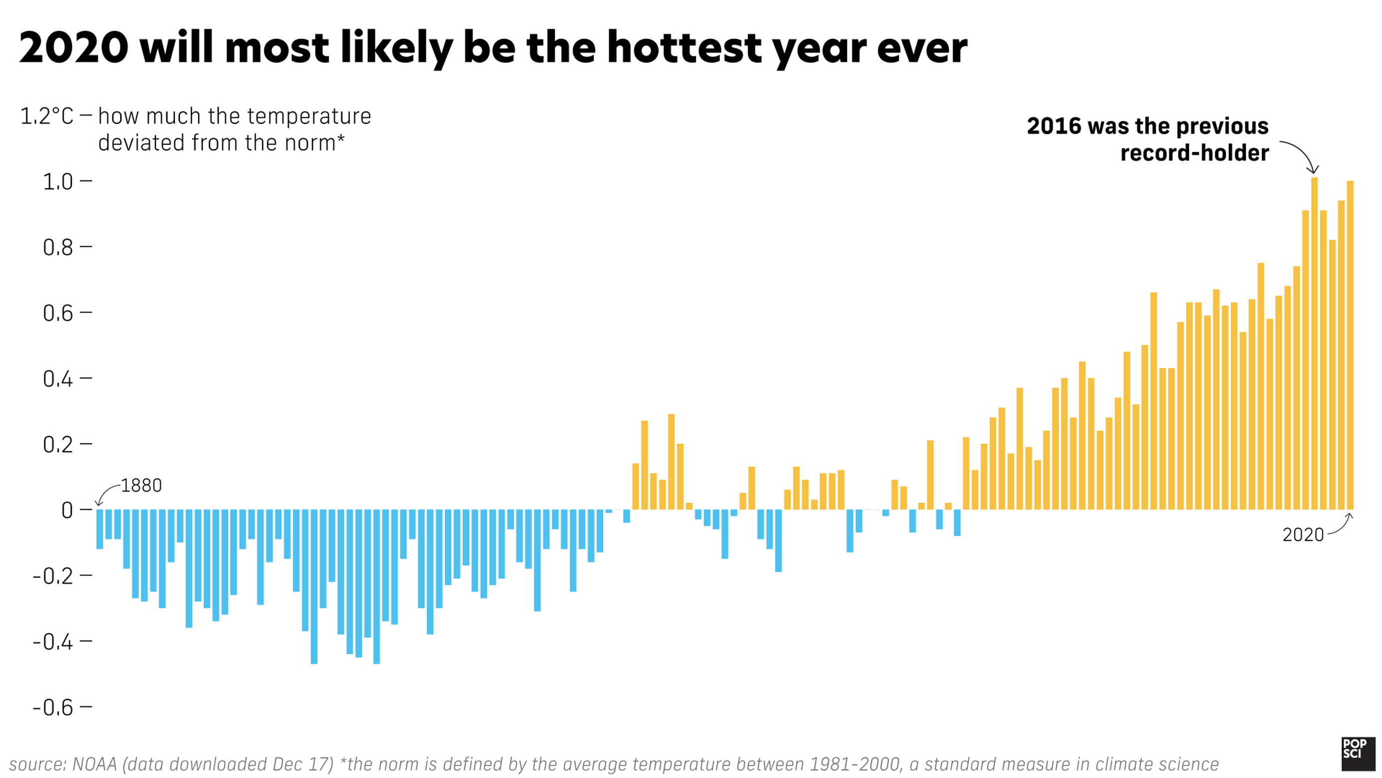 4. 2020 este pe cale să primească titlul de cel mai fierbinte an din istorie. A fost un an superlativ din multe puncte de vedere și, cel mai probabil, va mai marca încă o maximă: cel mai fierbinte an înregistrat. Anterior, 2016 deținuse titlul ilustru. Înainte de 2016, 2015 deținea titlul și înainte era deținut de anul 2010. Clima se încălzește într-un ritm alert și facem puțin pentru a o încetini. În ciuda faptului că viața, așa cum o știm, a încetinit și am emis mult mai puțin dioxid de carbon decât anul trecut, am produs în continuare 40 de miliarde de tone metrice de CO2. (popsci.com)