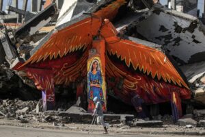 Fotografia dimineții – Un bărbat în cârje trece pe lângă o pictură murală de pe o clădire distrusă din tabăra de refugiați Maghazi, din Gaza. Eyad Baba/AFP/Getty Images: