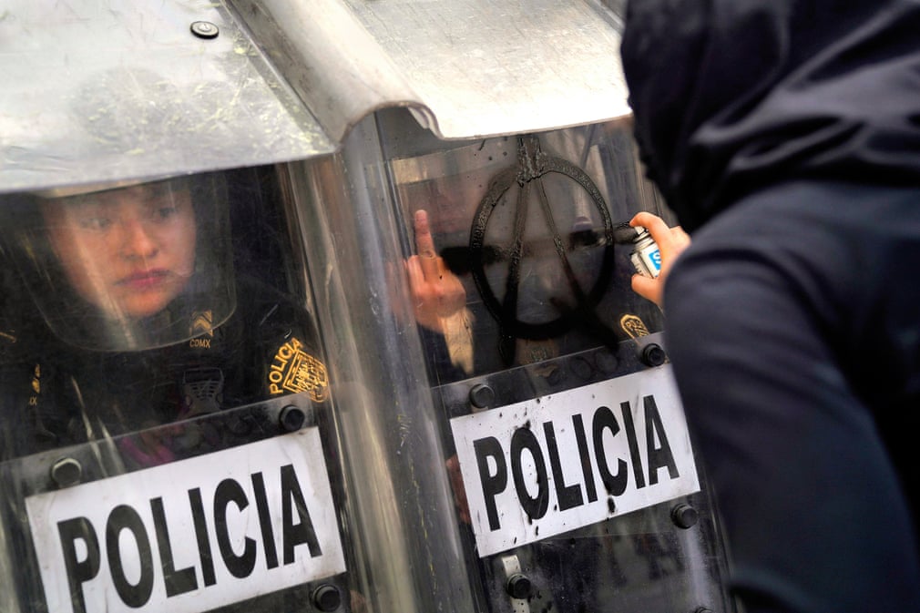 Fotografia serii – Un polițist face un gest către o membră a unui feminist care îi desenează pe scut în timpul protestelor din Mexico City. Toya Sarno Jordan/Reuters: