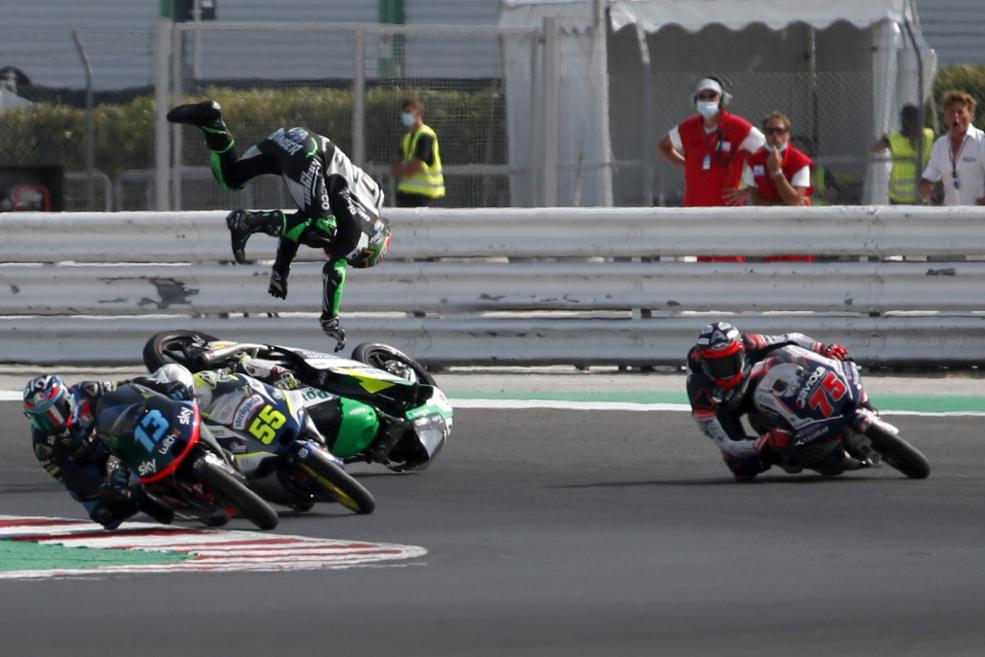 Fotografia săptămânii: Instantaneu din timpul unui accident din cursa MotoGP de la Misano Adriatico, Italia. Sursă: AP Photo/Antonio Calanni.