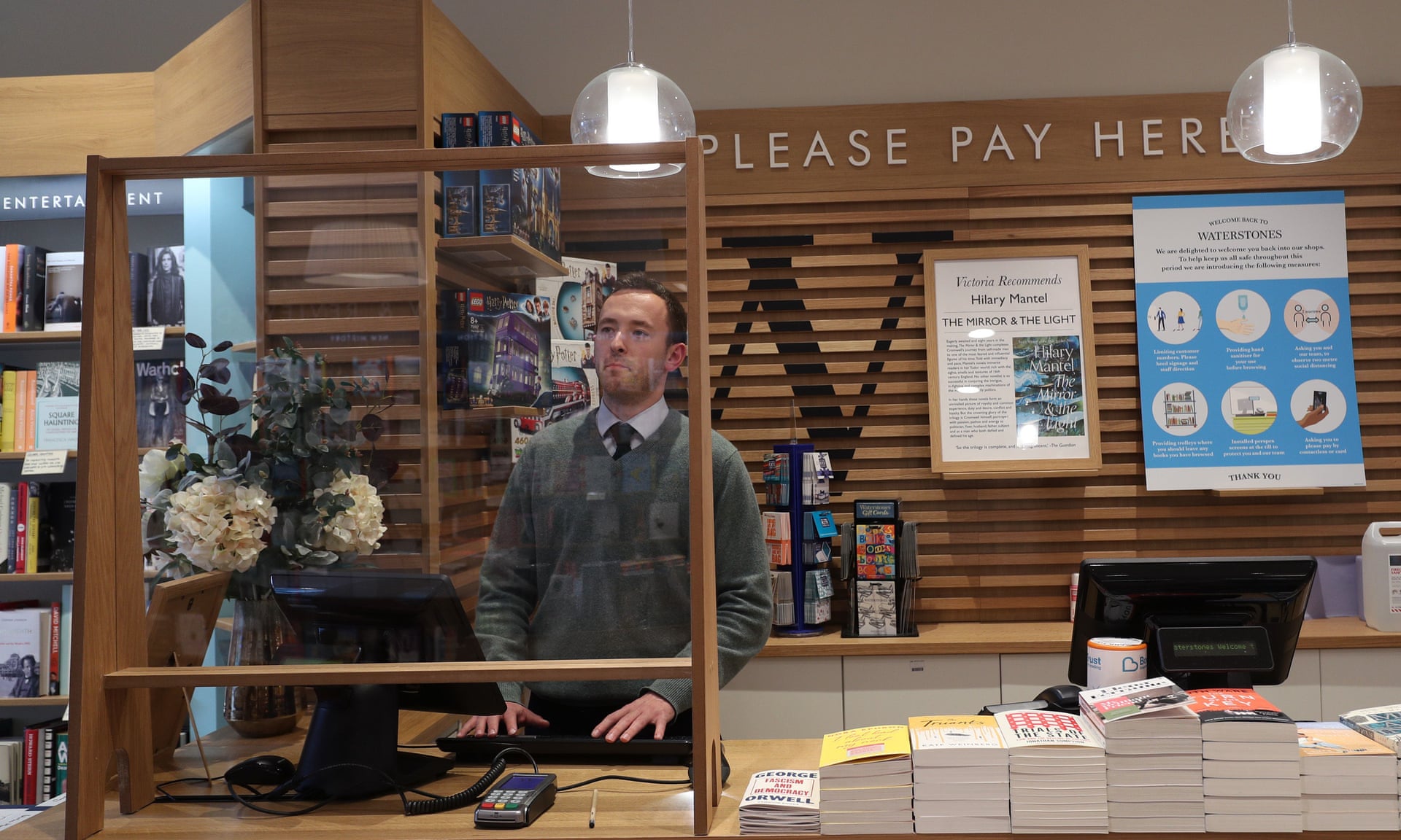 Fotografia ediției: Panouri de protecție la redeschiderea librăriilor din Anglia. Sursa: The Guardian.