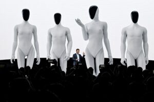 Fotografia dimineții – He Xiaopeng, cofondator și președinte al producătorului chinez de vehicule electrice Xpeng, lansează robotul umanoid Iron al companiei în timpul conferinței de presă Ziua Inteligenței Artificiale. Jade Gao/AFP/Getty Images: