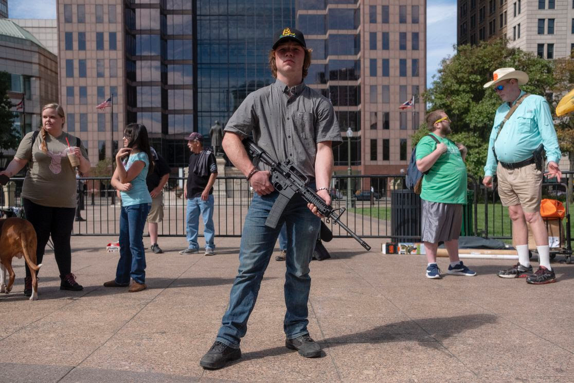 Fotografia dimineții – Un american își exercită dreptul de a avea arme la un protest în Ohio împotriva legii care prevede controlul armelor de asalt. Matthew Hatcher/Getty Images: