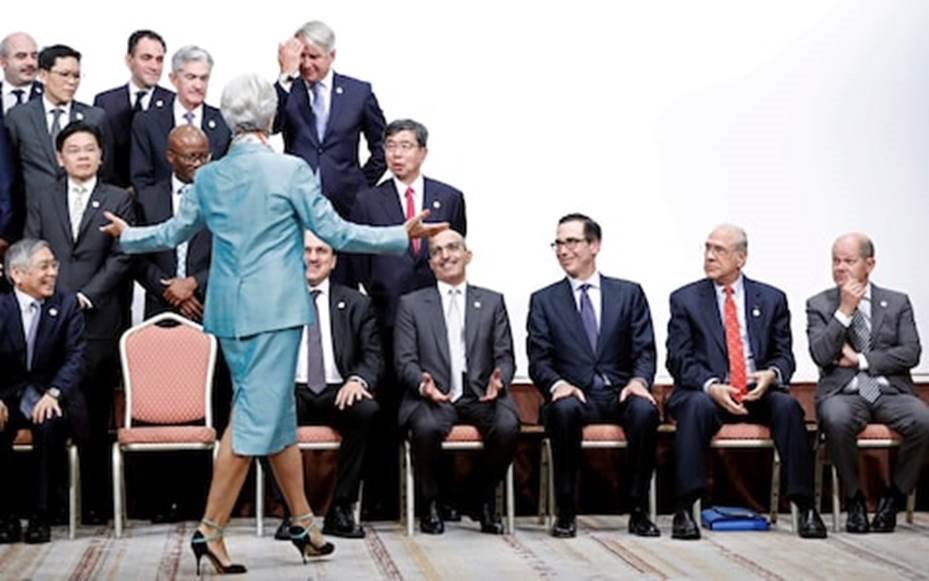 Fotografia dimineții – Ministrul român de finanțe, Eugen Teodorovici, își aranjează părul în timp ce șefa FMI, Christine Lagarde, își face “intrarea” pentru poza de grup de la finalul reuniunii G20, a miniștrilor de finanțe:
