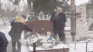 Fotografia dimineții – Nostalgicii comunismului au tremurat din nou la mormântul lui Nicolae Ceaușescu. Vreo zece oameni s-au strâns, ca în fiecare an. Un fost vecin din comuna natală i-a adus două tablouri. La plecare, le-a luat cu el, ca să le reașeze acasă, pe pereți. Trei „tovarăși” au depus coroane, alții au dezbătut problemele politice ale țării. Digi24: