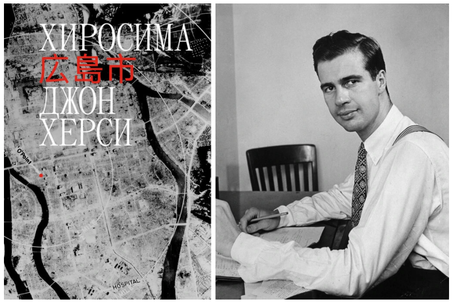 Fotografia ediției: Volumul ”Hiroshima” în limba rusă și autorul său, John Hersey. Sursă: New York Times.
