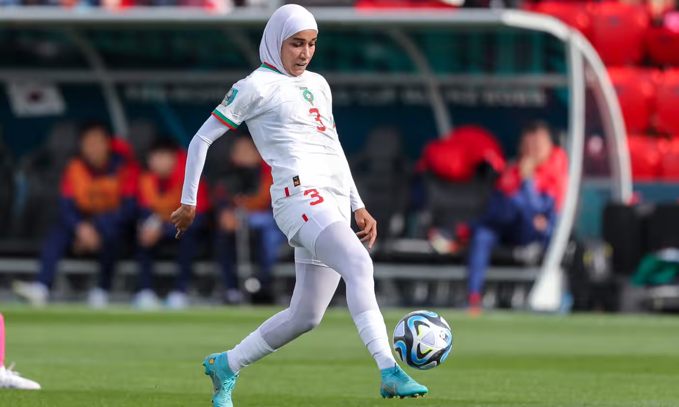 Fotografia dimineții – Nouhaila Benzina, din Maroc, a devenit prima jucatoare de fotbal feminin care poartă hijabul la o Cupă Mondială. Matt Turner/AAP: