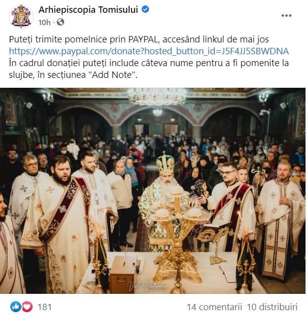 Fotografia dimineții – Arhiepiscopia Tomisului a transmis enoriașilor, printr-un mesaj publicat pe Facebook, că primește pomelnice și prin intermediul PayPal: