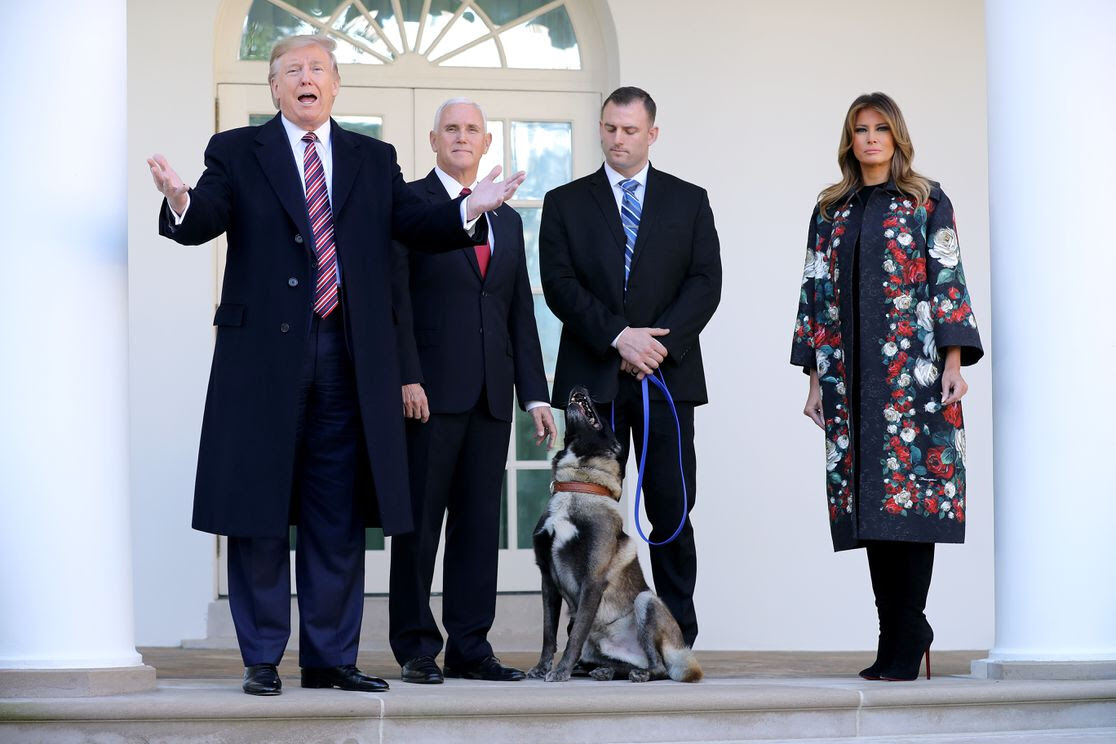 Fotografia dimineții – Conan, câinele care a ajutat la capturarea lui Abu Bakr al-Baghdadi, a fost primit la Casa Albă de președintele Trump. Chip Somodevilla/Getty Images: