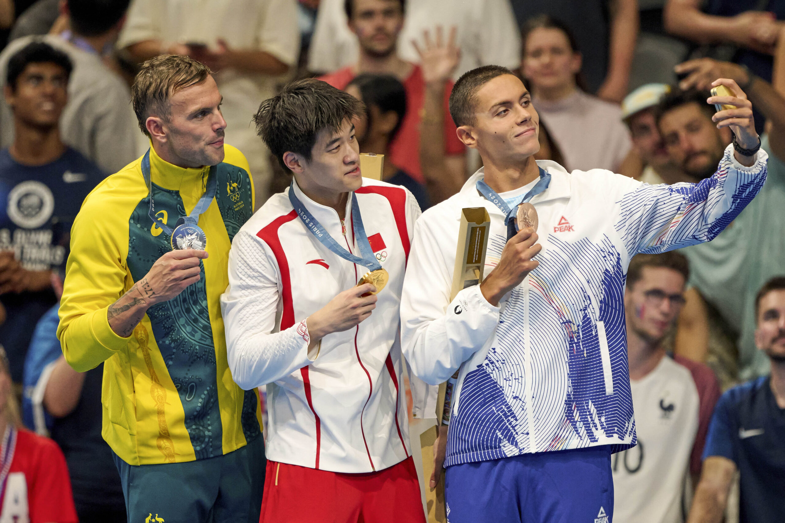 Fotografia dimineții – David Popovici face un selfie, pe podium, dupa ce a câștigat medalia de bronz la 100 m liber, la Jocurile Olimpice de la Paris. Inquam Photos / Colette Rochefort: